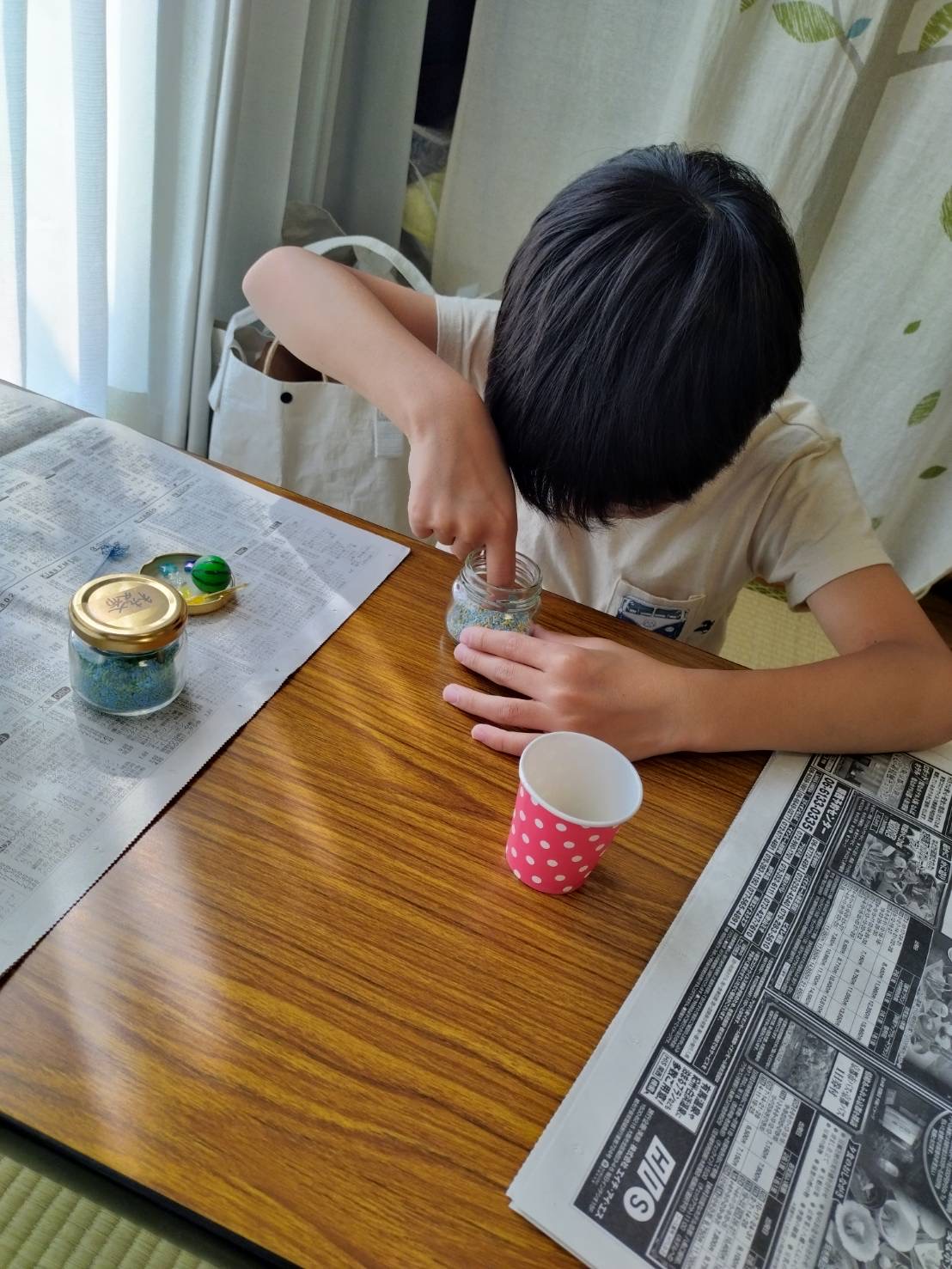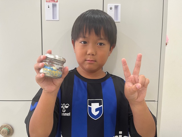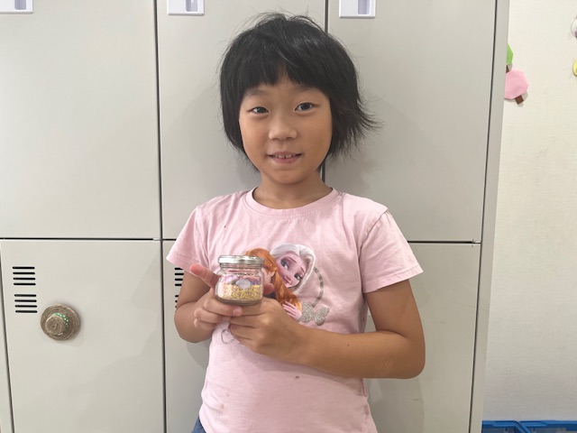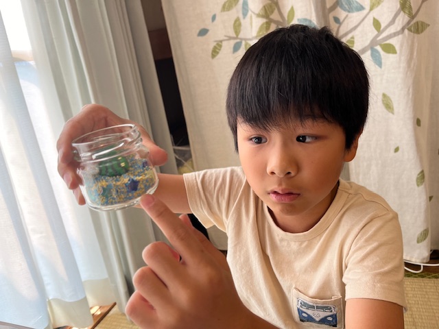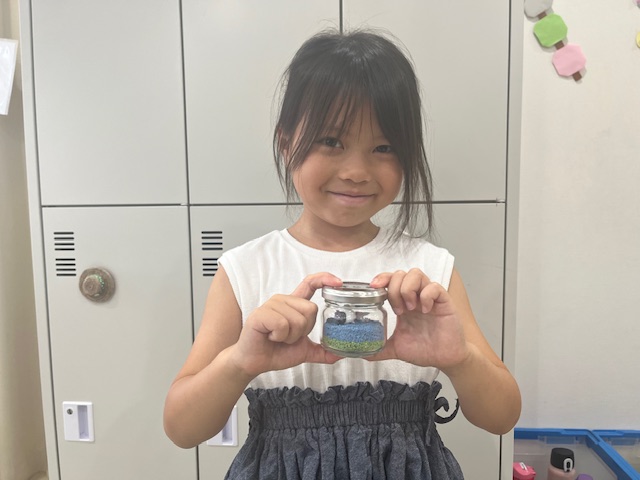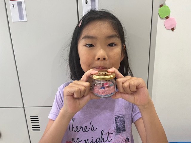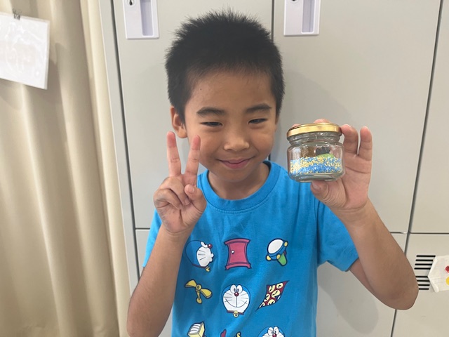 数種類の砂を混ぜたり、あえて層を作って重ねたり、星のビーズを瓶の壁に沿って埋め込んだり、小さな瓶の中にこどもたち一人一人の物語があります😊