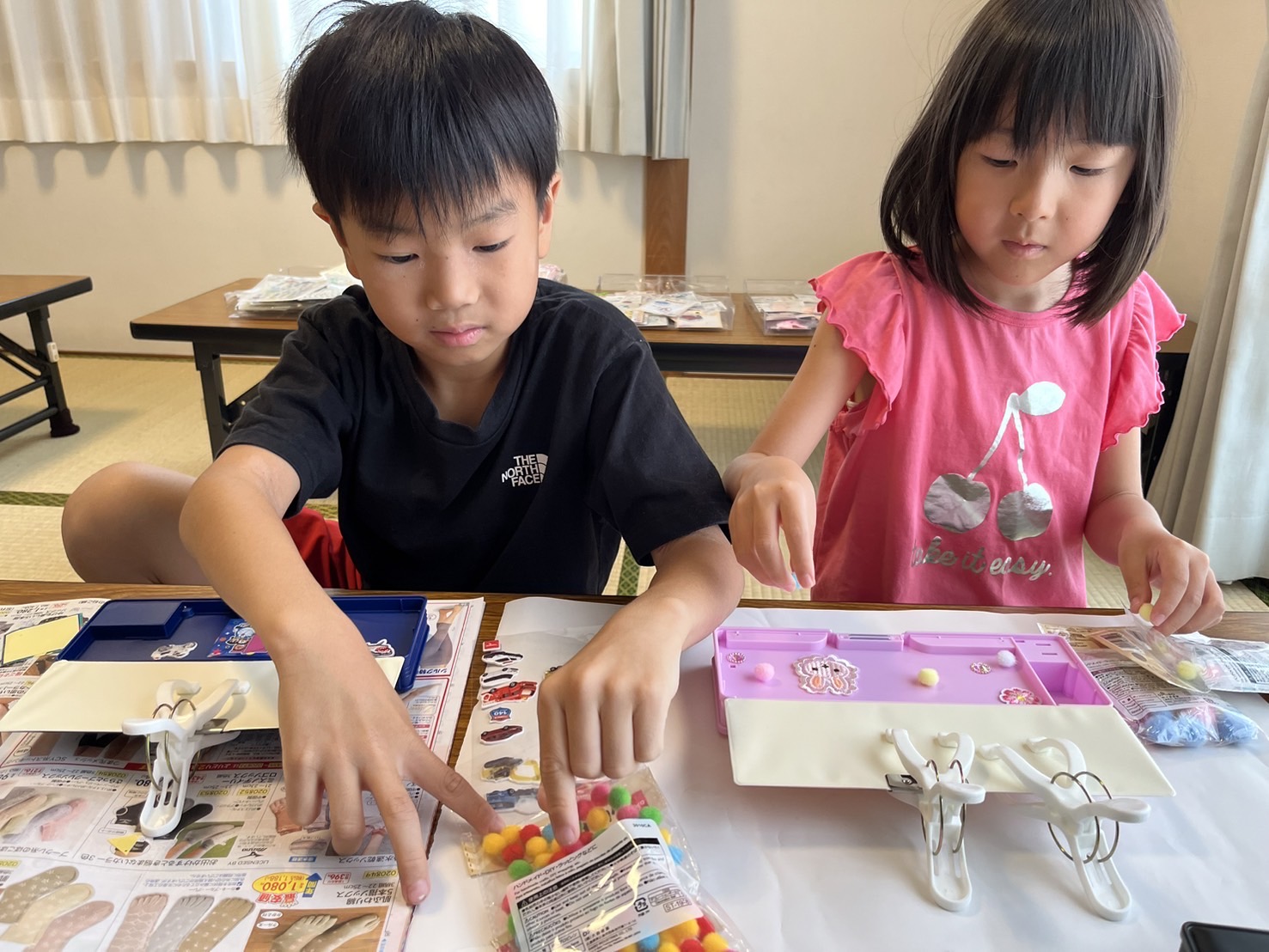 そしてたくさんの種類のワッペンやシール、ボンボンなどから自分の好きな飾りを選んでつけていきます❢たくさんありすぎて迷ってしまう子がたくさん😚