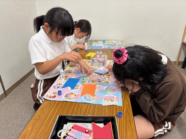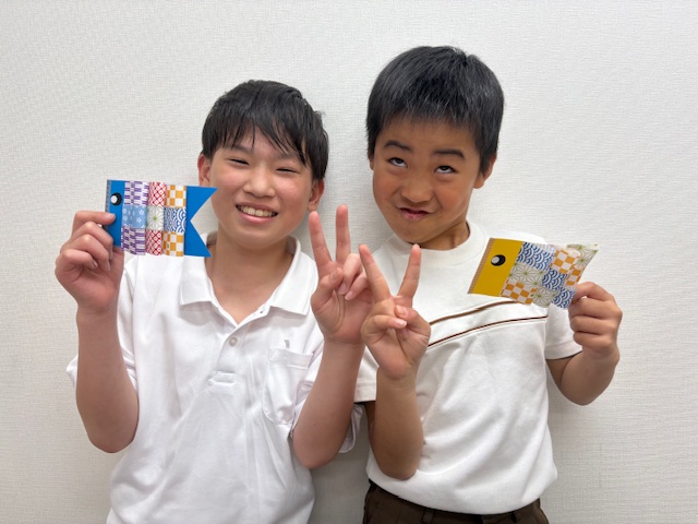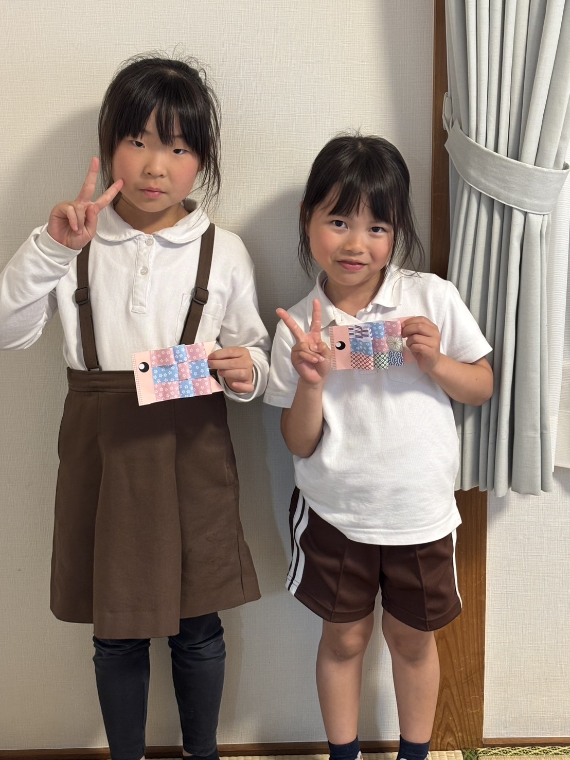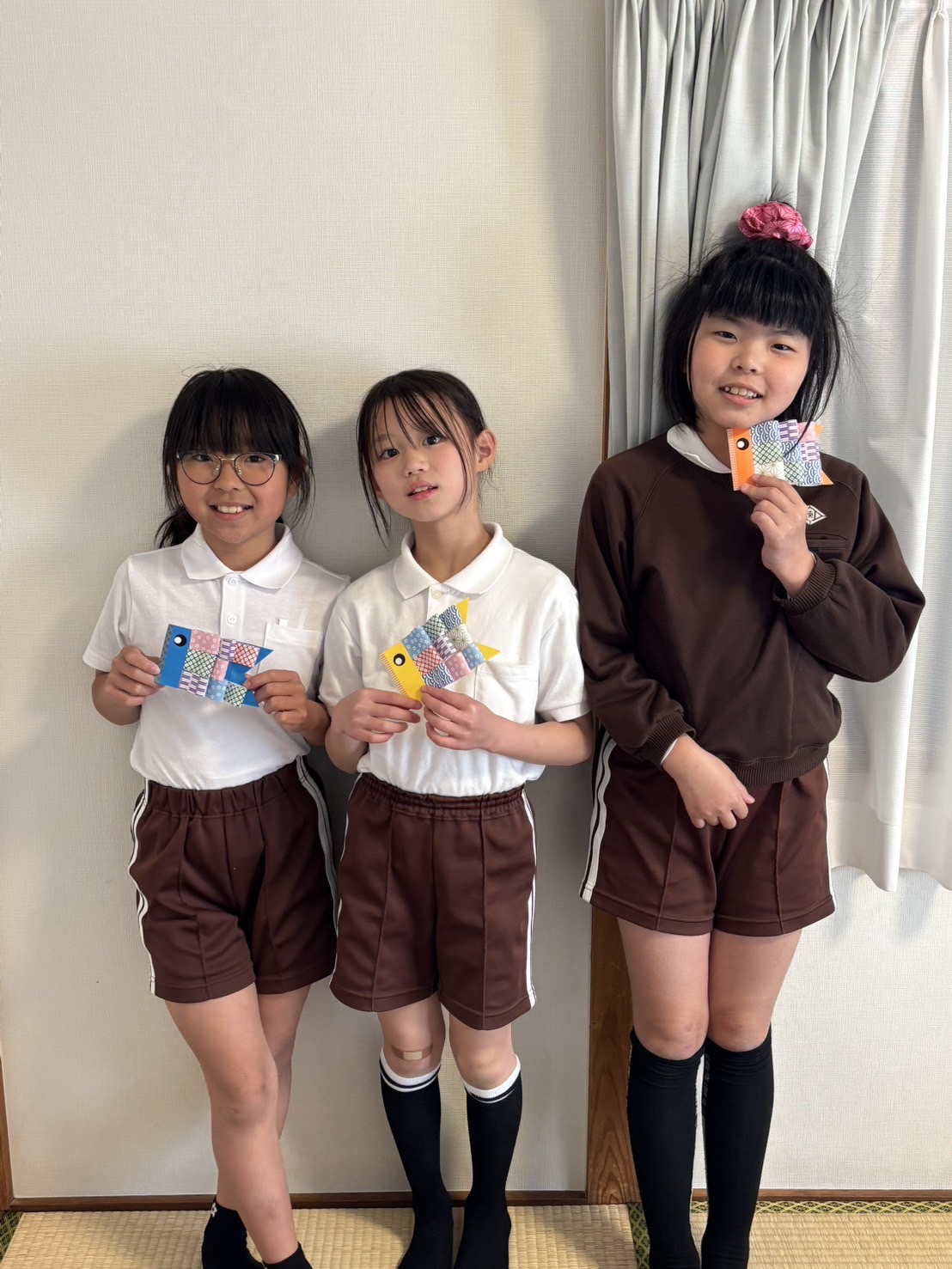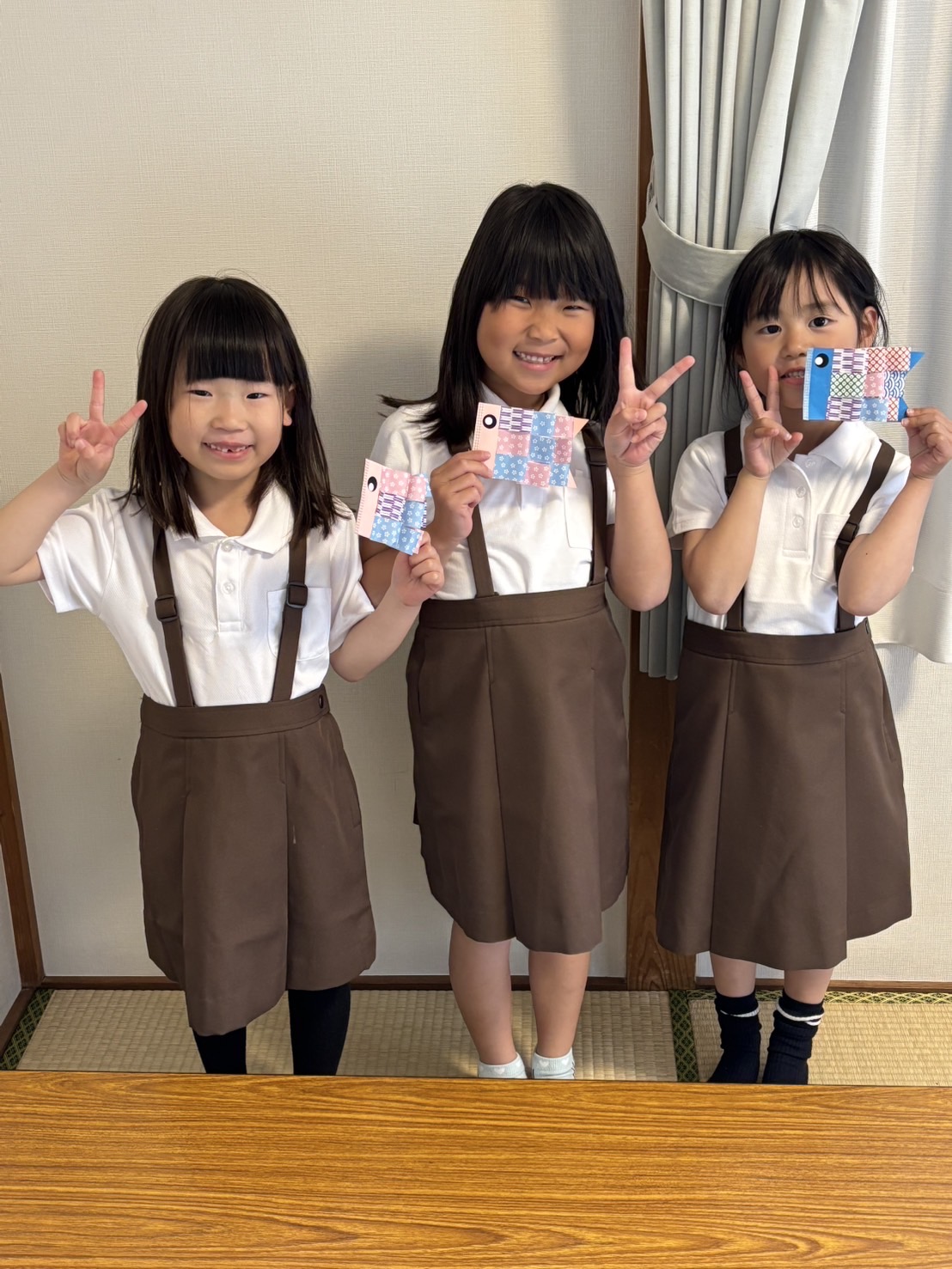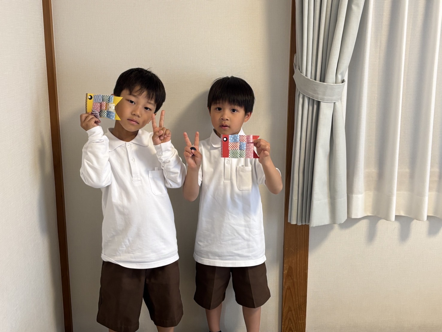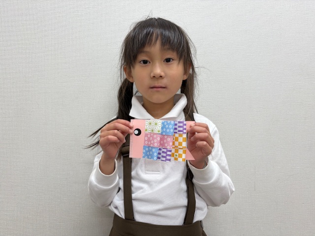 こいのぼりの形をした台紙に、長方形に切った和柄の折り紙を丸めて鱗にして9枚貼っていきます🌟