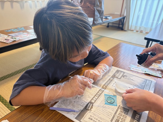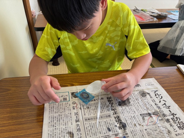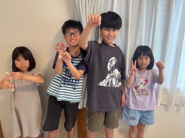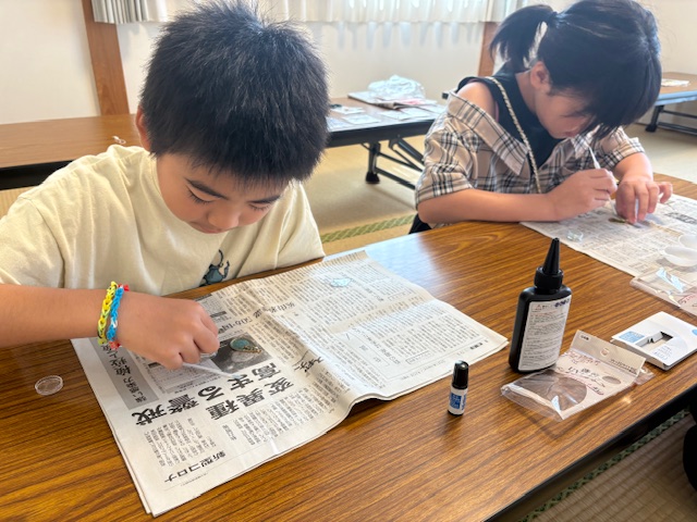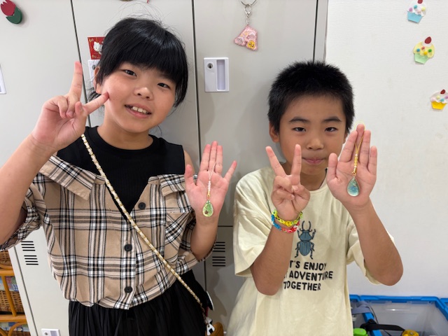 レジン液を層にして固め、飾りを入れるととてもきれいに仕上がりました✨ストラップを付けてキーホルダーにするとこどもたちもお喜びです😆早速かばんに付けたり、ずっと持っていたいとズボンのベルト留めのところに付けている子もいました~🎶