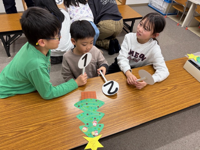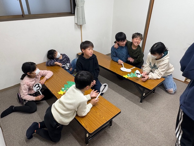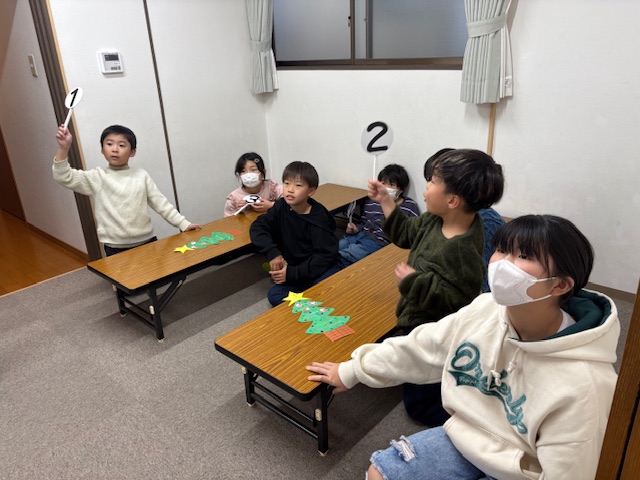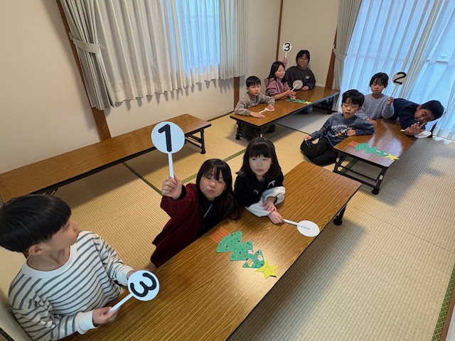 クリスマスに関する三択問題を10問出題してグループで話し合い、①~③の札を出します💡