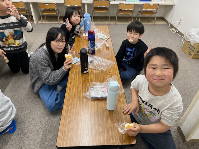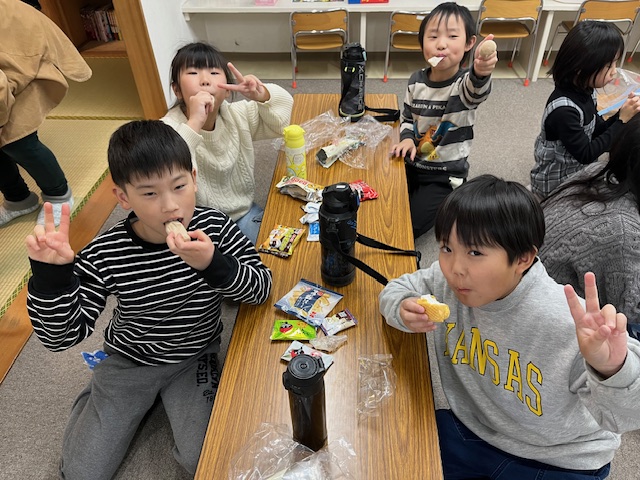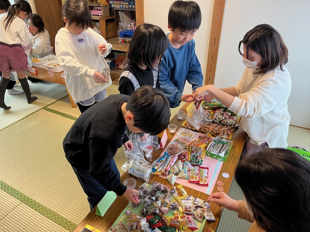 おやつはこどもたち大好きお買い物ごっこで、今日は100円・50円・30円・20・10円と、いつもよりもお菓子の種類を多くしました。こどもたちは悩みながらも、自分の好きなおやつを買って、とても満足そうにおやつを食べていました😋