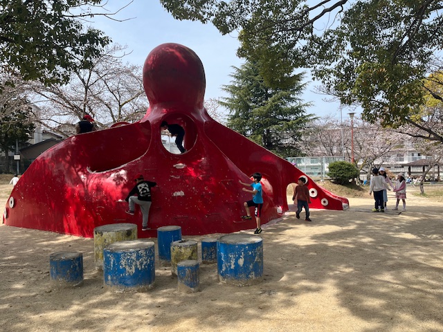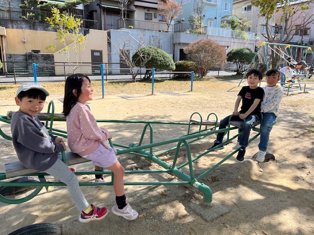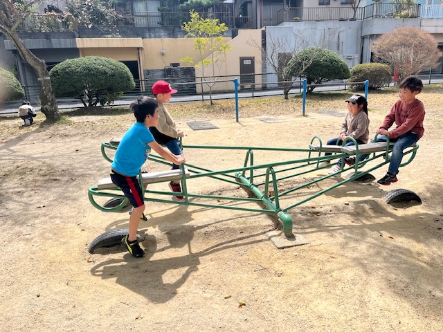ブランコやシーソー、すべり台の遊具で遊んだり、全員でダルマさんが転んだならぬ“ダルマさんの一日”という遊びをしています🎶