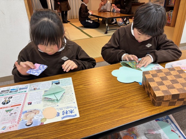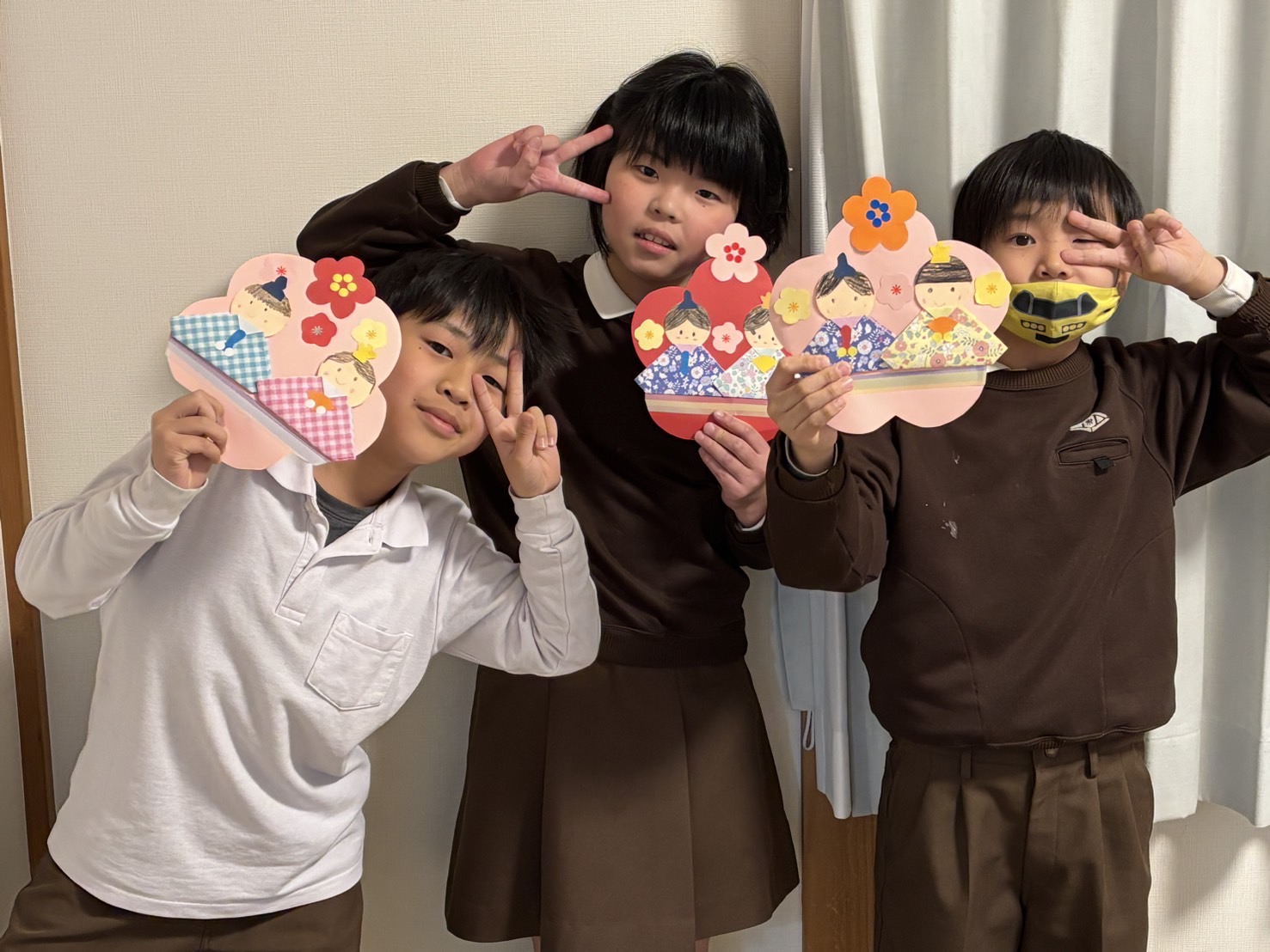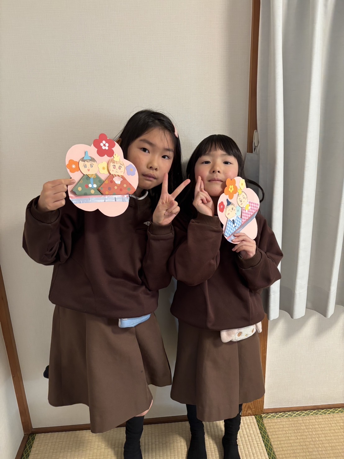 折り紙でお雛様の着物を折り、顔を描いたりお花を画用紙で作ったり、とても可愛らしいお雛様がたくさん完成しました✨